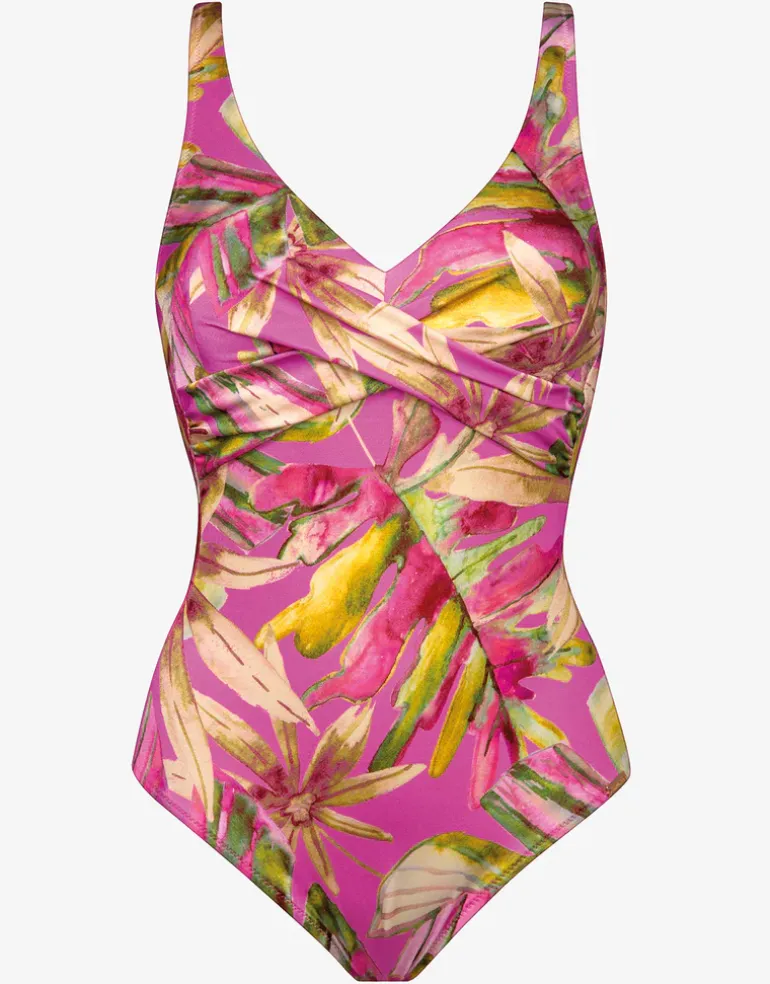The Pink Heart Wrap Front swimsuit from Charmline in a bright and beautiful pink foliage print featuring a silky, elegant glimmer to the fabric which is very flattering to the complexion. This wrap front style has moulded foam cups, adjustable straps and features light tummy control.