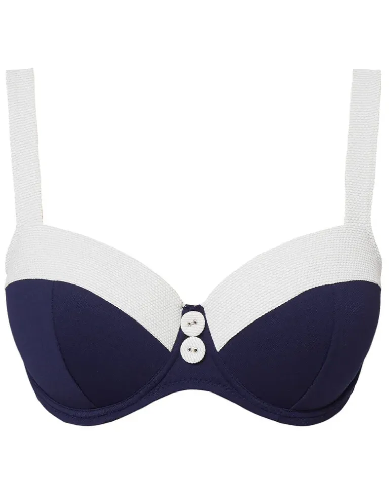 The Pitusa Balcony bikini top from Nuria Ferrer is a striking navy and white style with contrasting textured fabric to the cups and straps and decorative button detailing. The cups are underwired and moulded and the straps are adjustable.