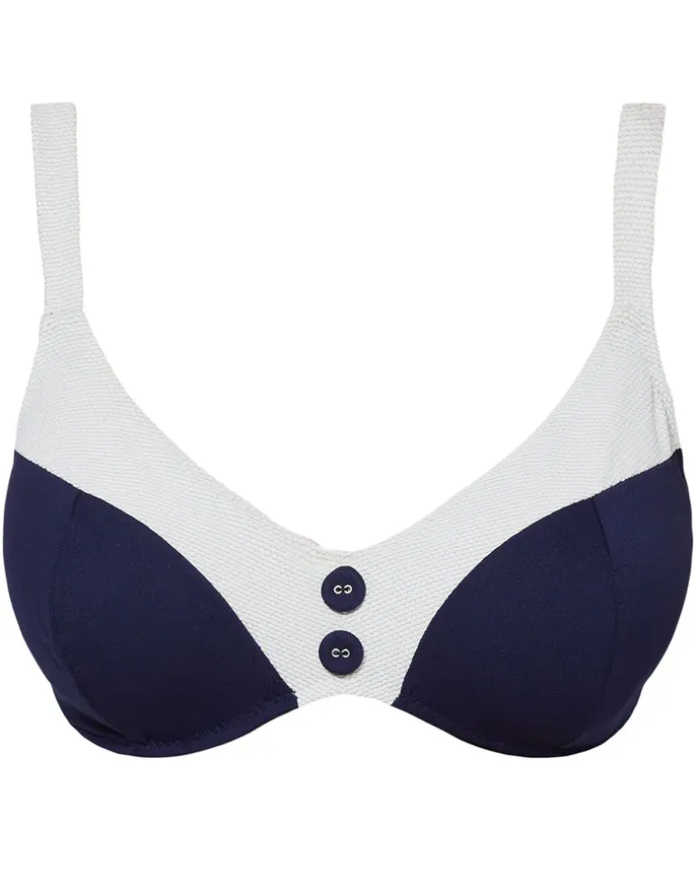 The Pitusa Plunge bikini top from Nuria Ferrer is a super navy and white textured fabric top in plunge style with button detail at the front. Inside there is underwire and the straps are adjustable.