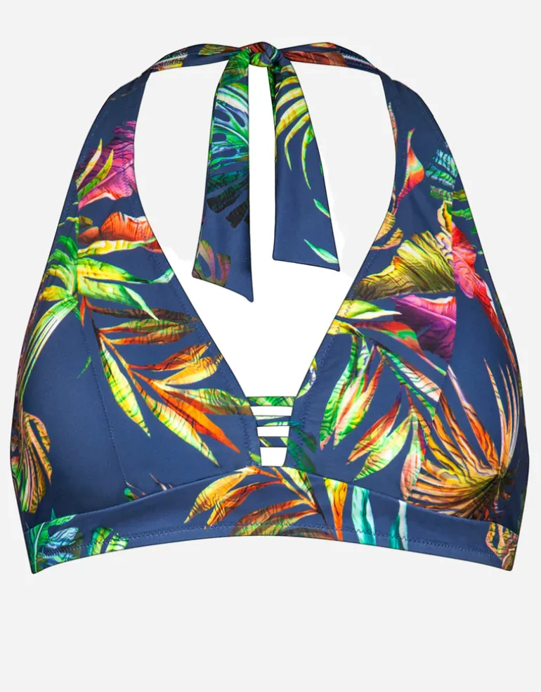 The gorgeous Plunge Moulded Halter bikini top from Lidea is a super bright tropical floral print on Indigo blue. In halter style with shaped cups, ladder detailing at the front a clip back and ties at the neck.