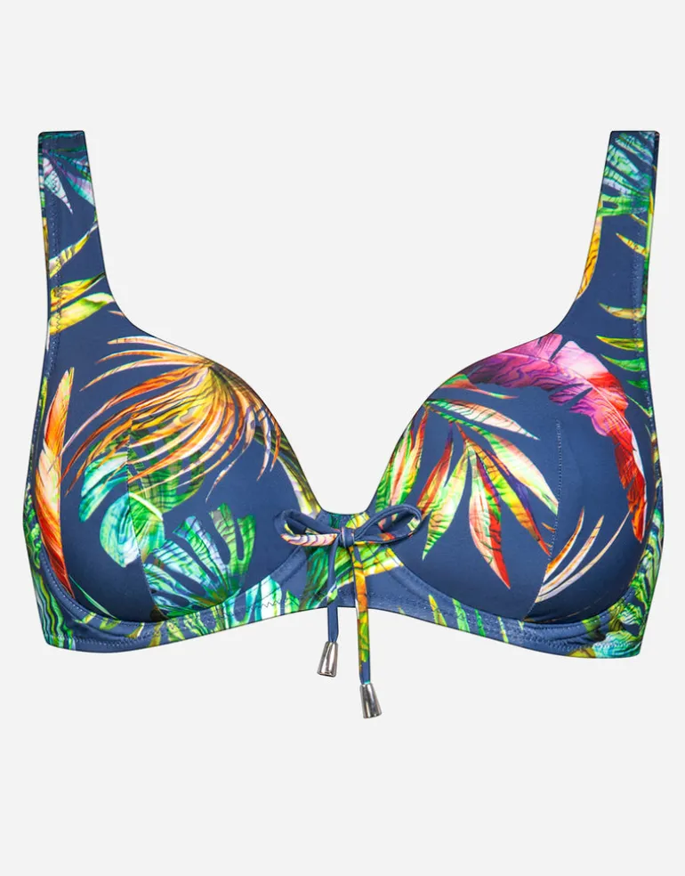The fabulous Plunge Moulded Underwired bikini top from Lidea is a fantastic supportive style with sizes up to F cup. In this super bright tropical floral print on Indigo blue, this comfortable bikini top has moulded underwired cups with eyelet and tie detail at the front, wide adjustable straps and a clip back.