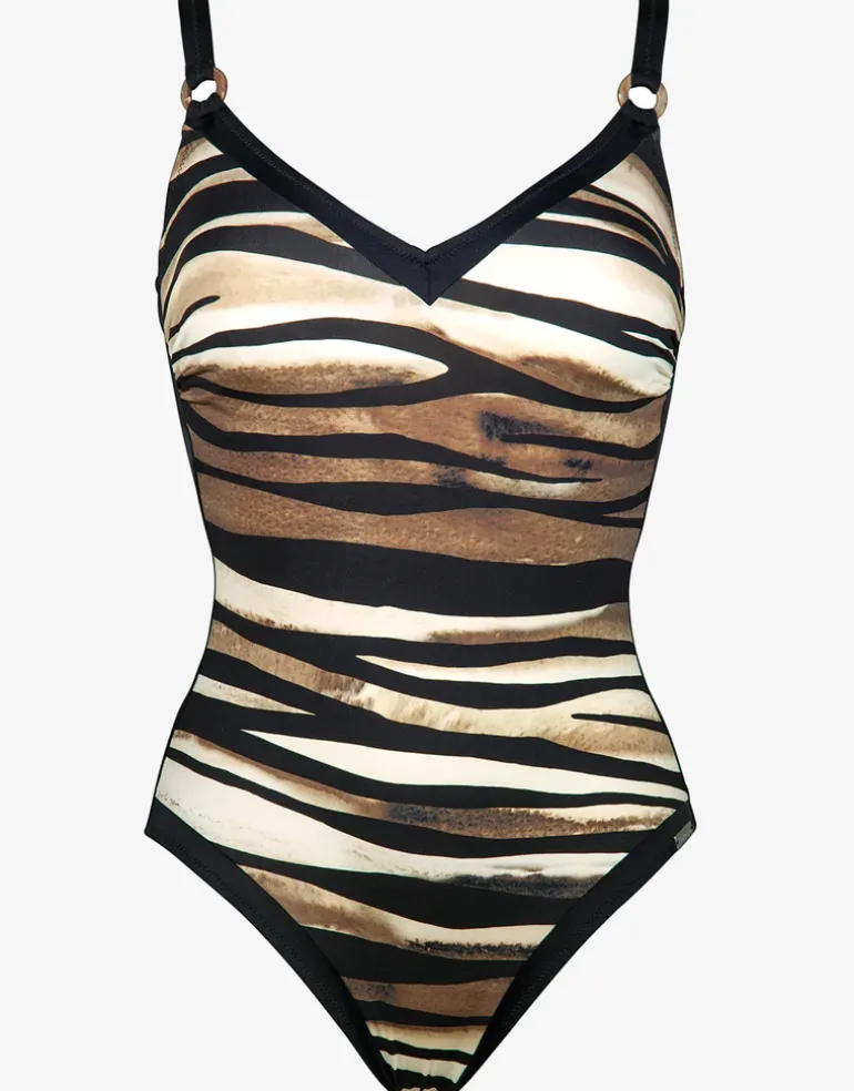 The fantastic Pool Safari Underwired swimsuit from Charmline is a striking black, brown and cream tiger print style with underwired, a V neck, rings at the adjustable straps and light tummy control.