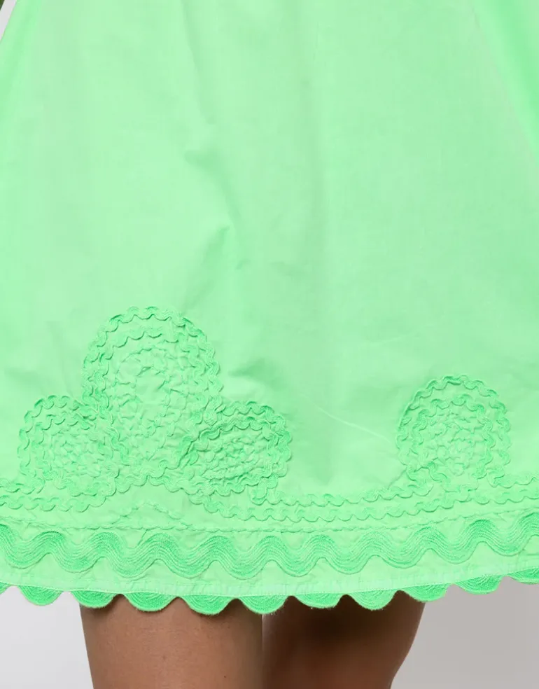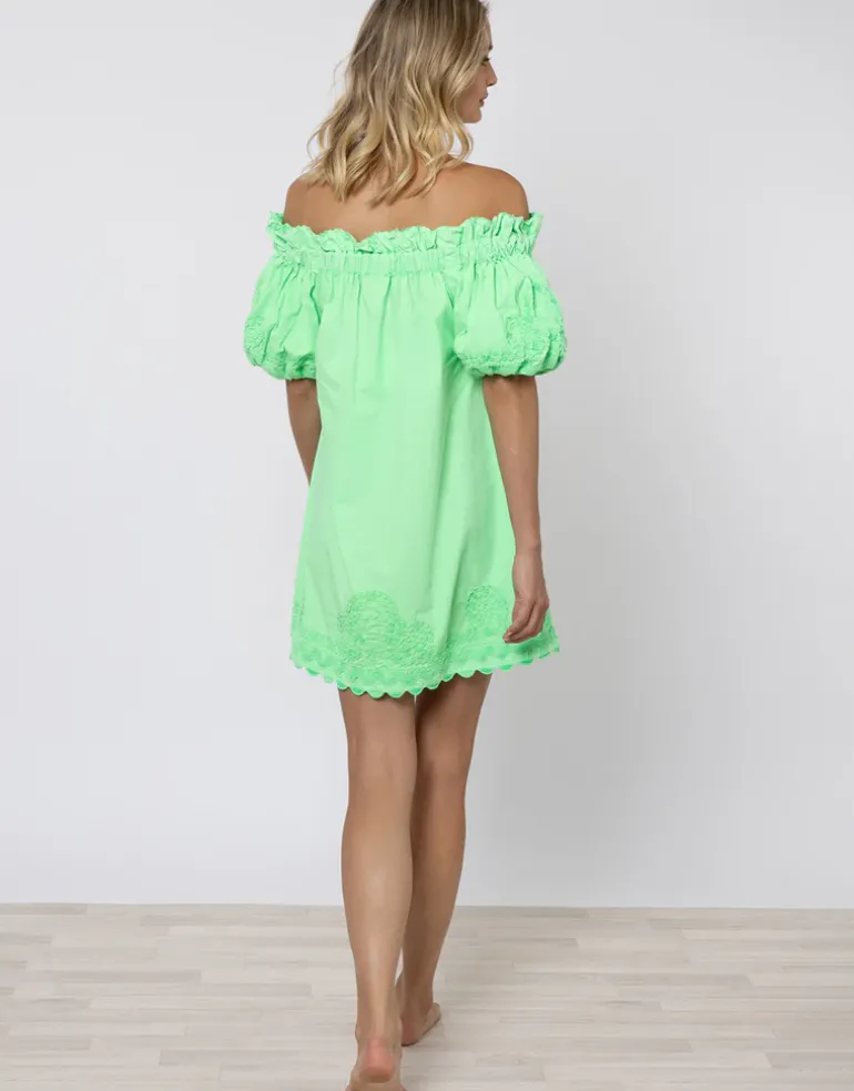 The Poplin Off Shoulder Mini Dress with Ric-Rac from Juliet Dunn is an off shoulder style in vibrant Apple green made from Poplin cotton. This mini dress has puff sleeves, a ruffled, elasticated neckline and Ric Rac embroidery over the hemline.