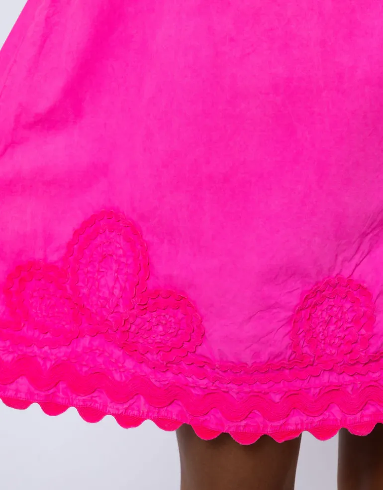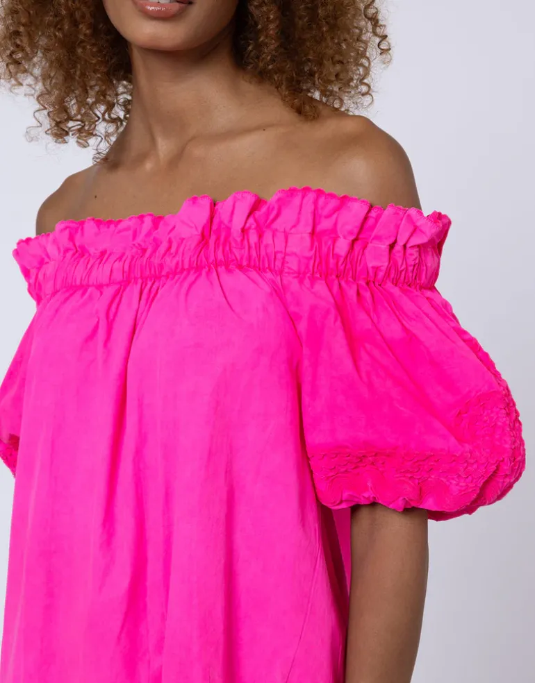 The Poplin Off Shoulder Mini Dress with Ric-Rac from Juliet Dunn in stunning Indian Pink is an off shoulder style made from Poplin cotton. This mini dress has puff sleeves, a ruffled, elasticated neckline and Ric Rac embroidery over the hemline.
