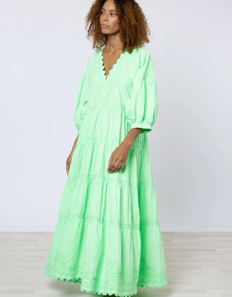 The Poplin V-Neck Loose Maxi Dress with Ric-Rac from Juliet Dunn in this vibrant Apple green is a tiered maxi dress with Ric Rac embroidery around the neck and hemline. With a loose, relaxed waist, three quarter puff sleeves and plunging neckline.