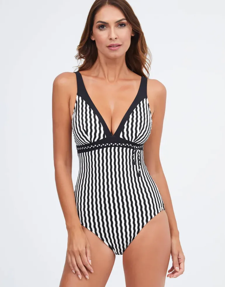 The Portofino V Neck swimsuit from Nuria Ferrer has a plunging front with contrasting neckline and slimming contrast panel under the bust with woven tie detail. With soft padded cups, adjustable straps and tummy control.