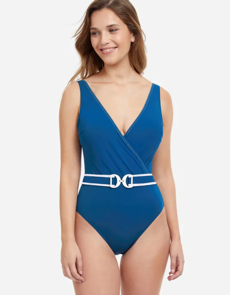 The California Girl Belted Wrap swimsuit from Profile by Gottex is a simple but stylish swimsuit in Petrol blue with a wrap front, comfortable wide shoulder straps, soft padded cups and a contrasting white edged, decorative belt at the front.