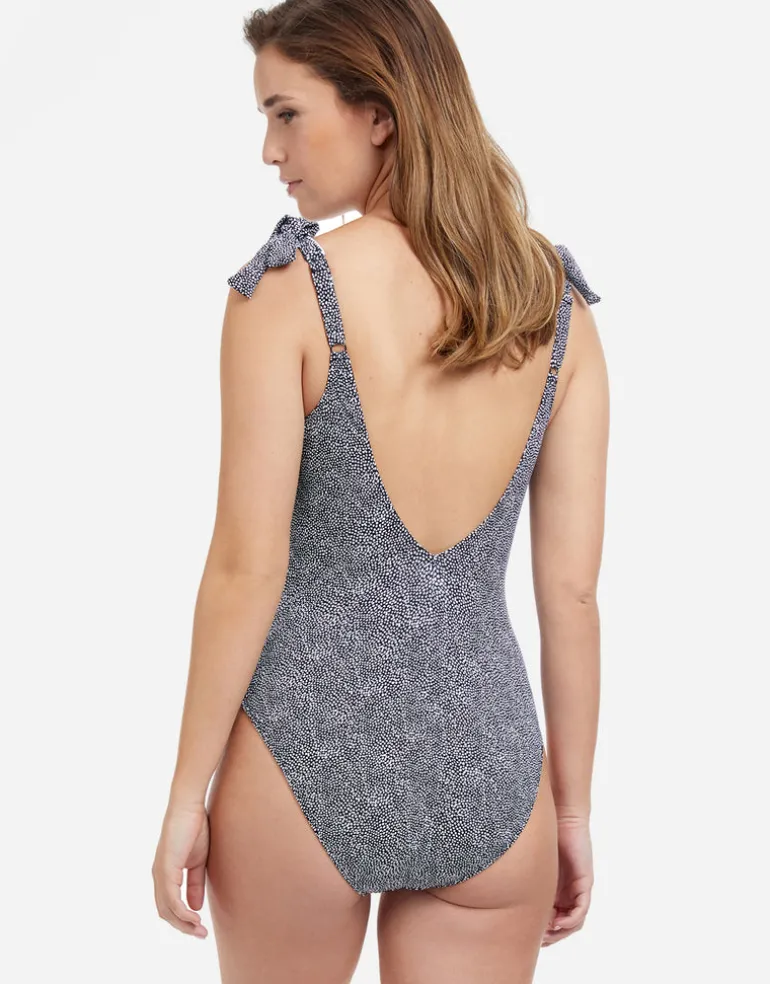 The Colette V Neck swimsuit from Profile by Gottex is a pretty black and white ditsy print with white piping and feminine decorative bows at the shoulders. With tummy control and soft padded cups.