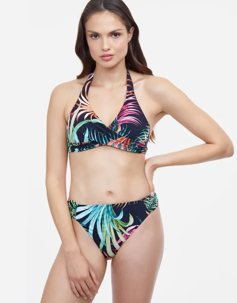 The Tropico Halter bikini top from Profile by Gottex is a striking tropical print on black in a classic halter style. With crossover wrap at the front, soft cups and ties at the back and neck, this top is a great shape and can be tied into the perfect fit.