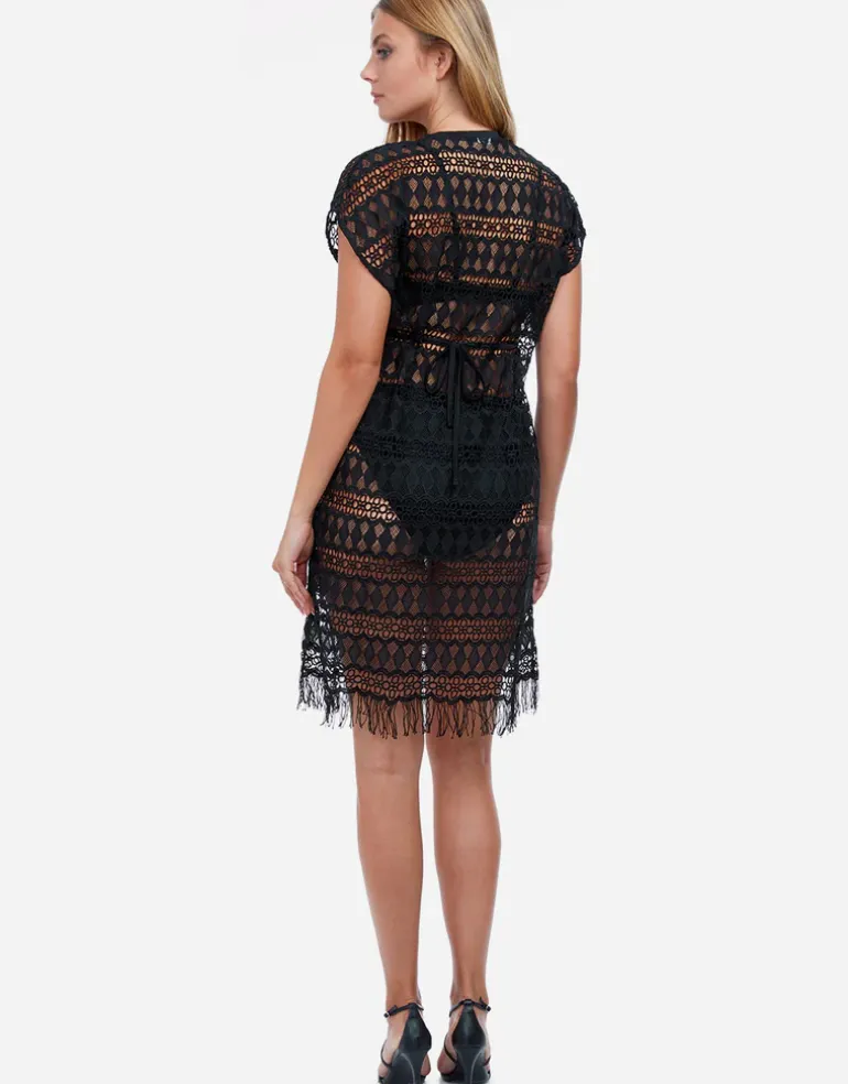 The Tutti Frutti Crochet plunge V neck dress from Profile by Gottex is a pretty throw-over style in polyester lace. With a deep plunging V neck and fringe detailing at the hem.