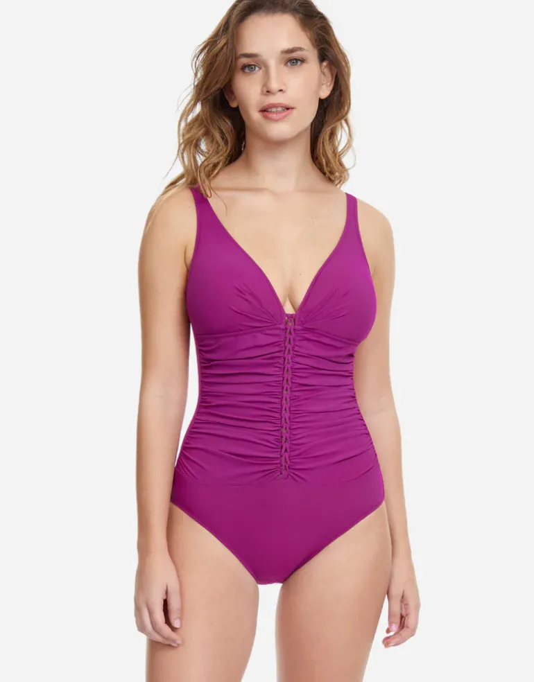 The Tutti Frutti D Cup V Neck swimsuit from Profile by Gottex in lovely Warm Violet is a pretty plunging V neck style with ruching across the tummy and a vertical macrame feature at the centre front. With soft padded cups, tummy control and adjustable straps.