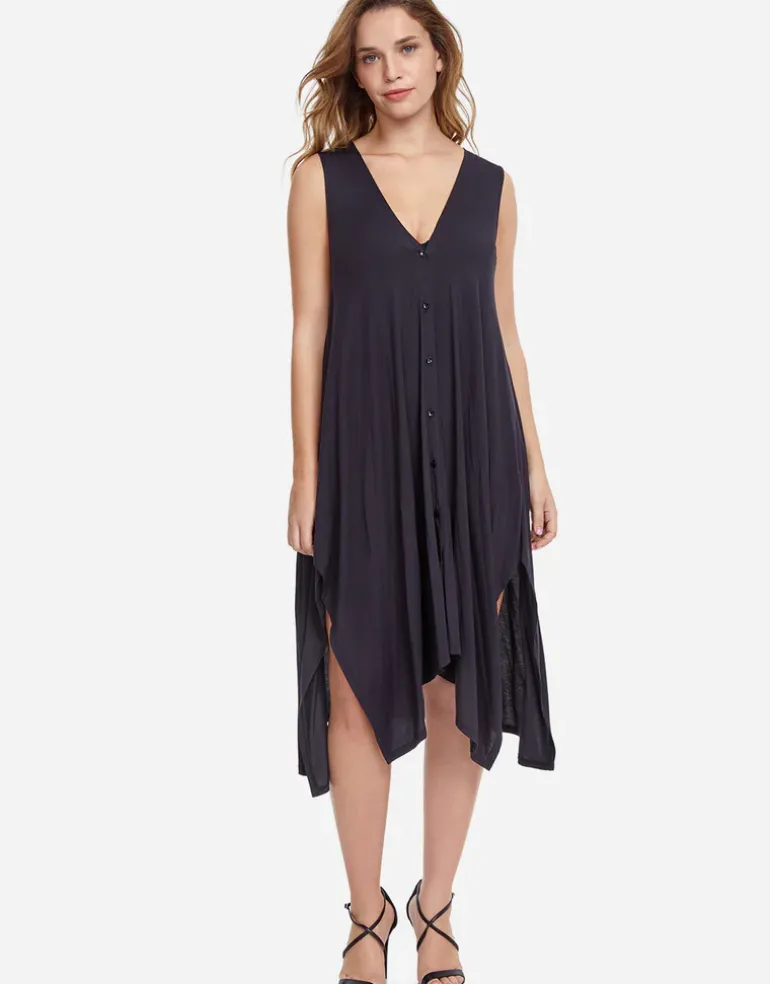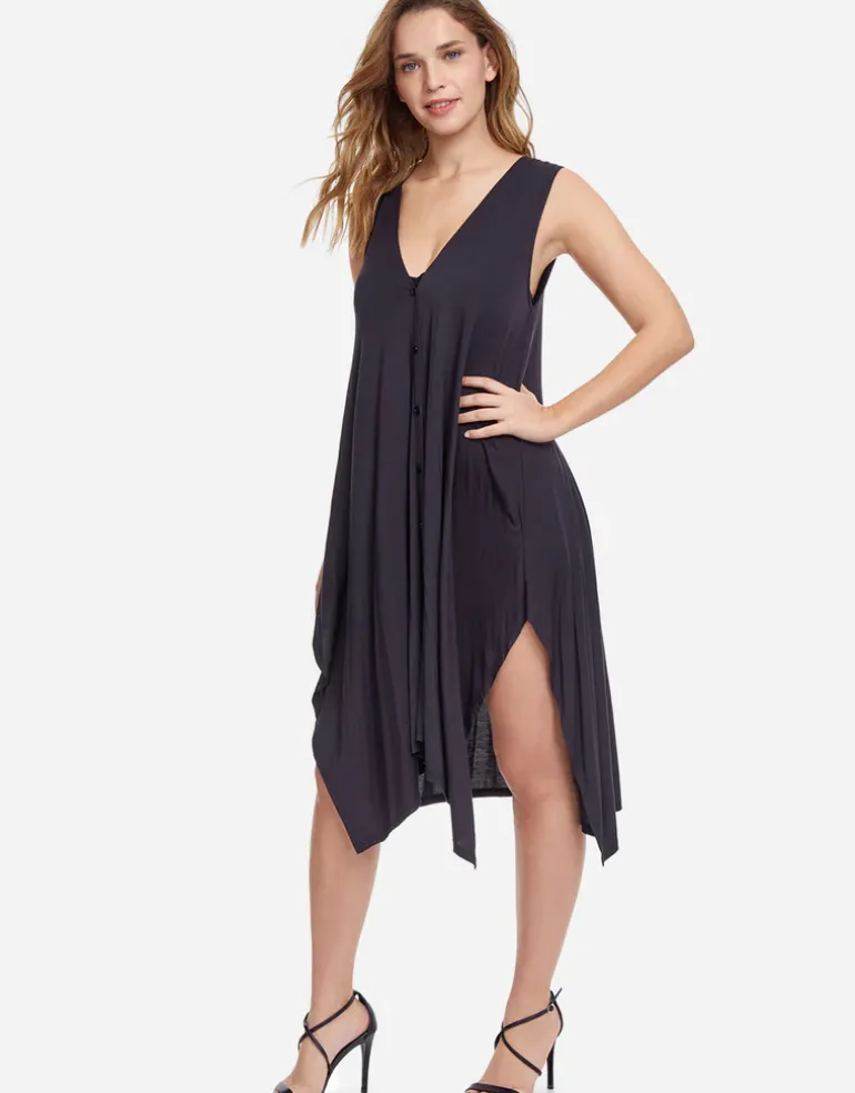 The Tutti Frutti Jersey Dress from Profile by Gottex is a great loose fitting beach dress with a V neck, buttons at the front and a high low hemline with side slits.