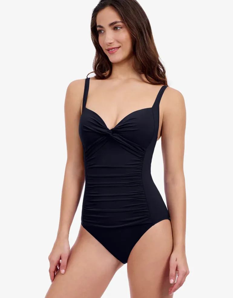 The Profile Tutti Frutti Sweetheart Twist swimsuit from Profile by Gottex in classic black, is a really flattering one-piece with a sweetheart neckline and twist front combined with ruching across the tummy and tummy control fabric for a flattering silhouette. Soft, padded cups and adjustable straps provide further shape and support.