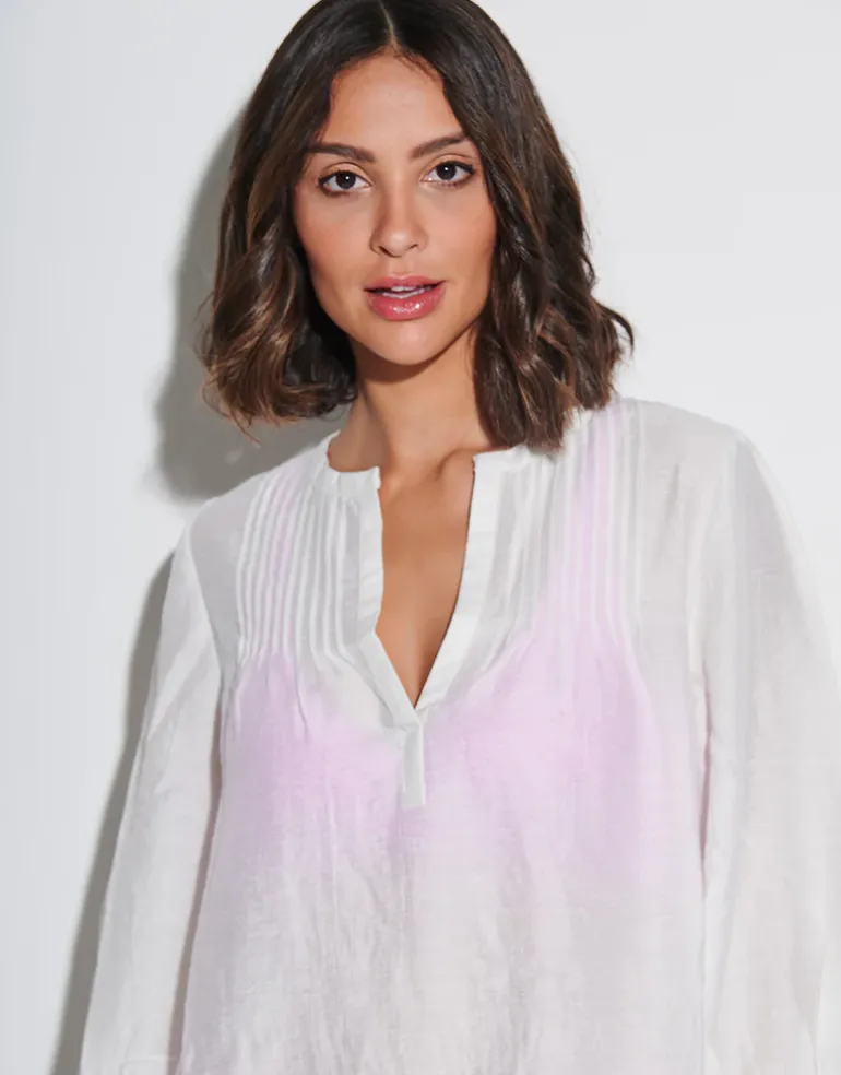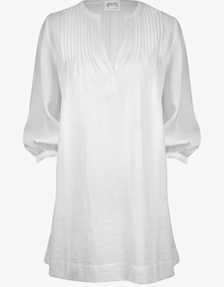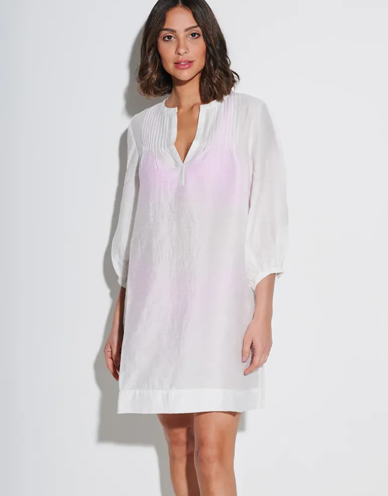 The Radiance Tunic from Maryan Mehlhorn is a summery soft white, elegant tunic to cover up your swimwear. With a V neck, three-quarter bell sleeves and pleat stitched piping at the front.