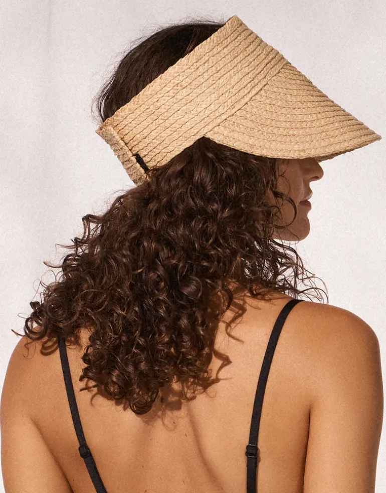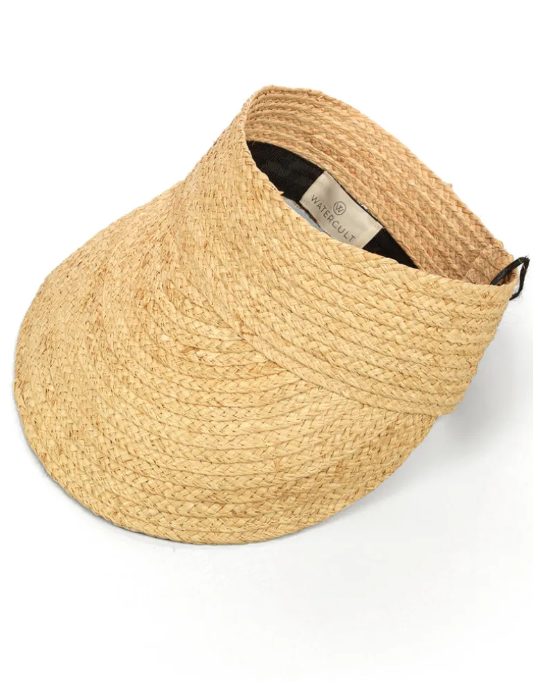 The Raffia visor from Watercult is a great for keeping the sun off your face. Made from natural coloured 100% woven Raffia with a wide brim.