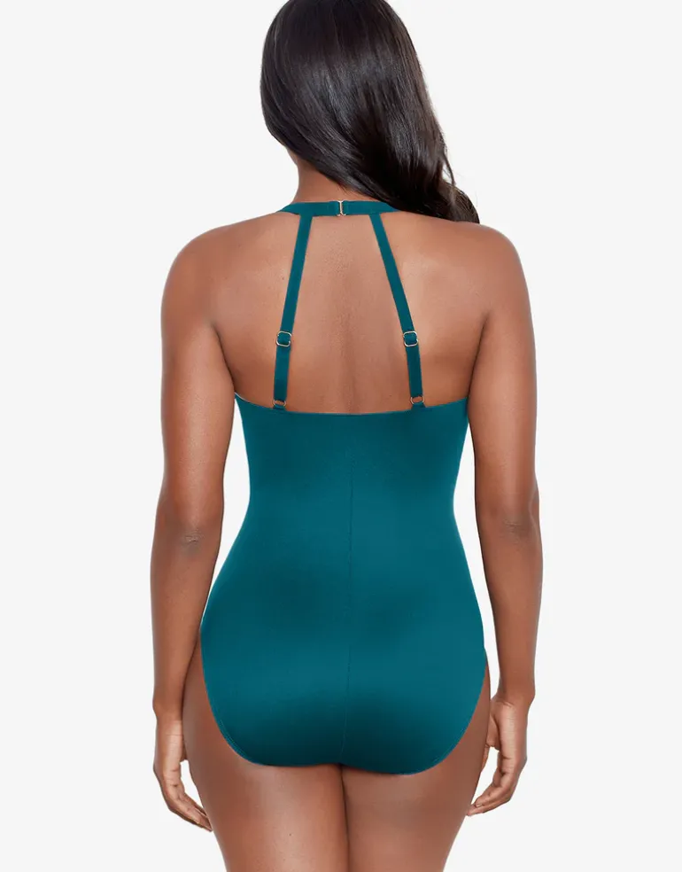 The Razzle Dazzle Bling swimsuit from Miraclesuit is a fantastic new style with a halter look neckline and a V-neck plunge front finished with a U bar detail at the bust. Inside there are soft cups and at the back, the adjustable straps come together in a feature detail.