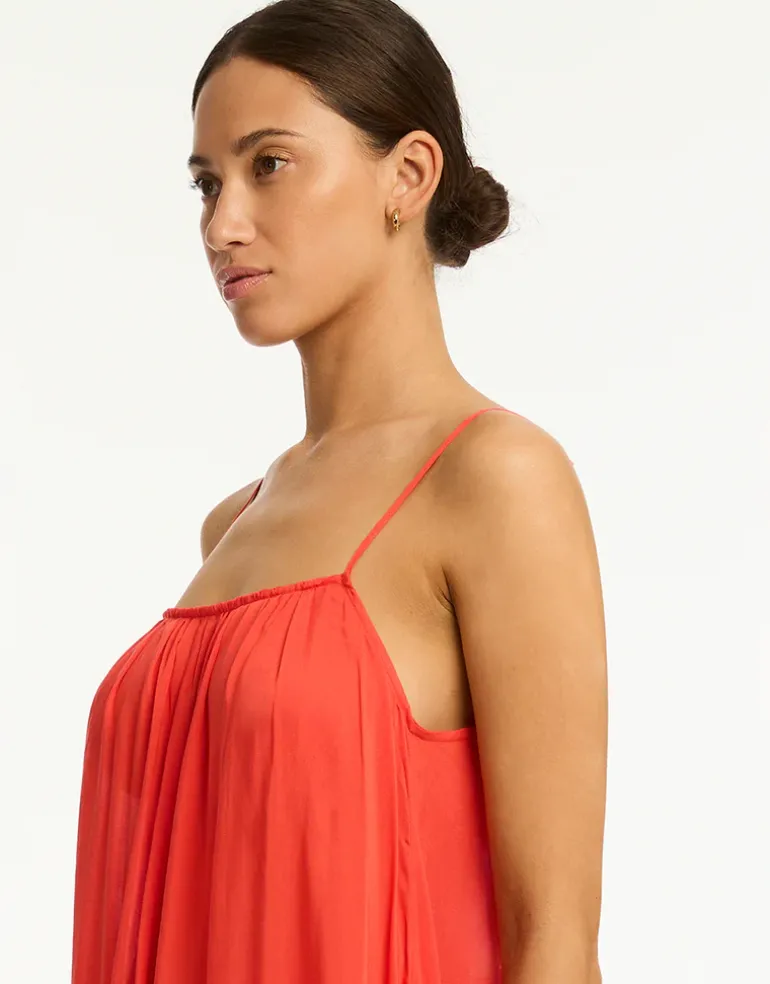 The Resort Essentials Maxi sundress from Sea Level in vibrant Flame red is a lovely, relaxed dress with pleating at the bust, thin adjustable straps, a low, scoop back and convenient side pockets.