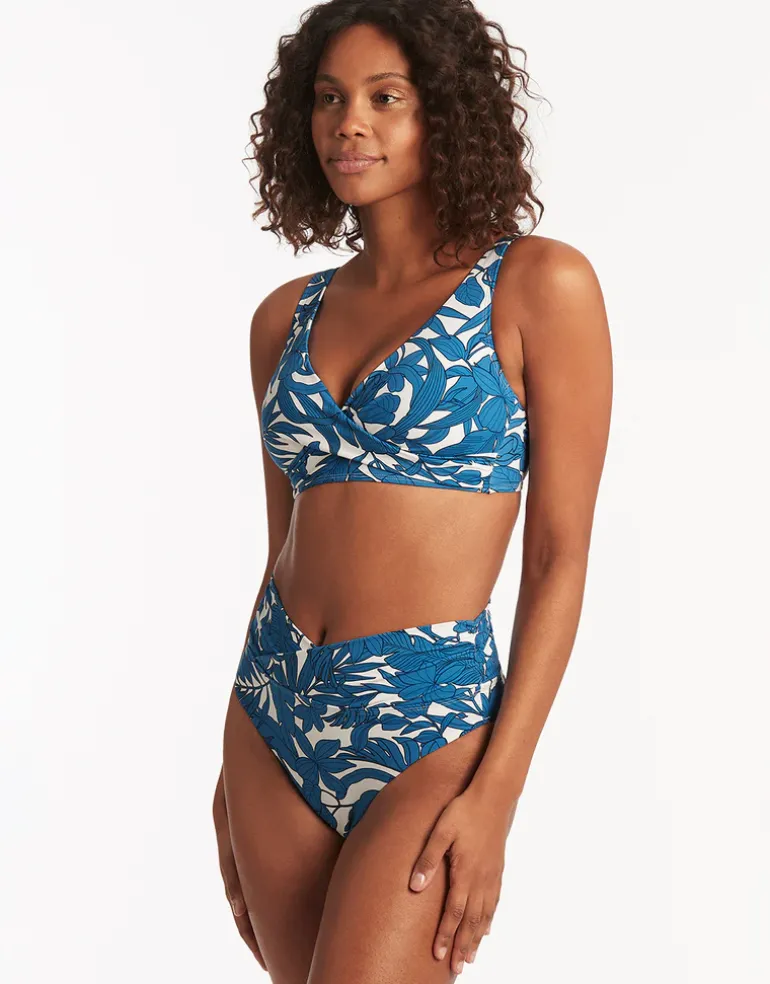 The Retreat Wrap High Waist bikini pant from Sea Level Australia is a pretty deep-blue and white oversized floral print high-waist bikini pant with a V shape wrap at the frton and full rear coverage.