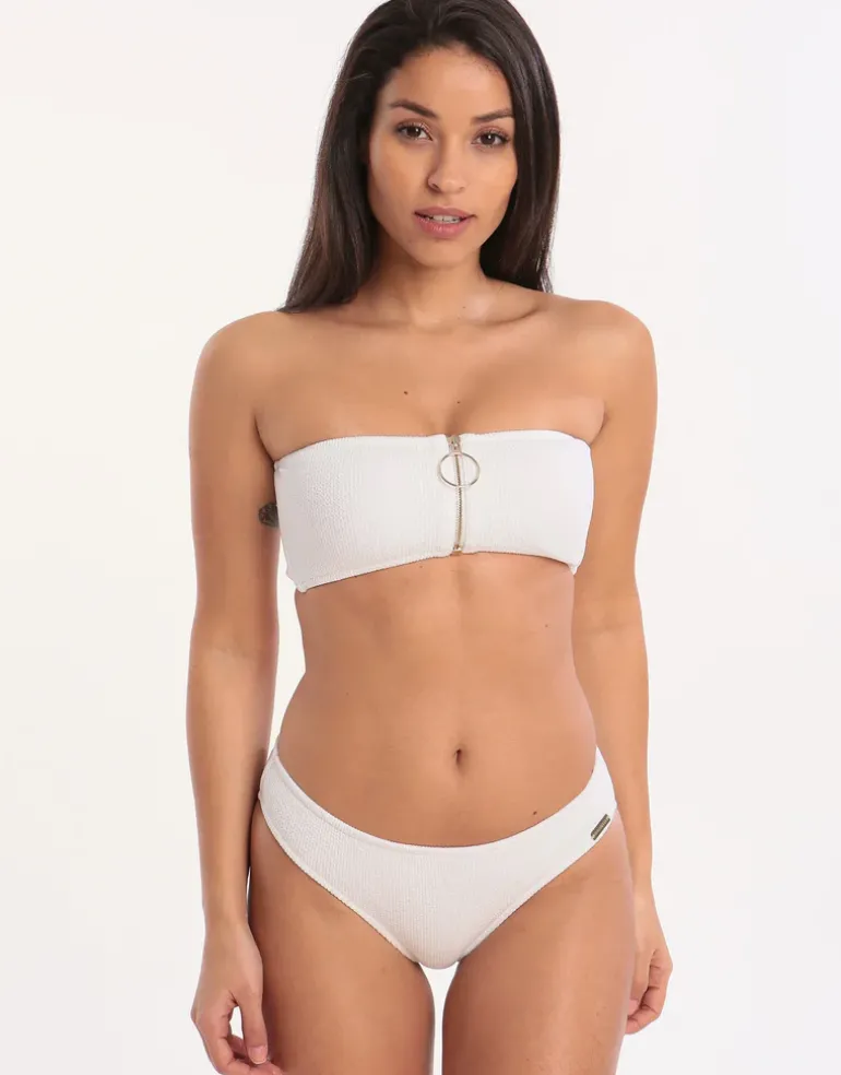 For the ultimate classic style with a twist be sure to add Watercult’s Retro Purity Zip Back Bikini Bottom in White.