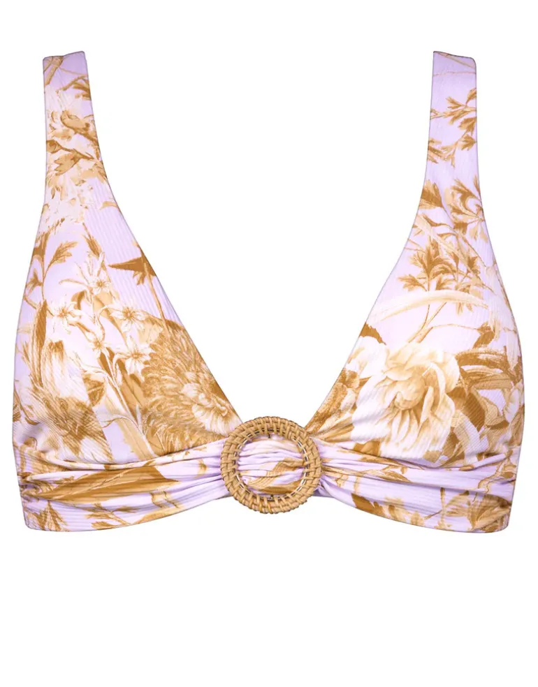 The Reverie Banded bikini top from Maryan Mehlhorn is a sophisticated floral print with straw and white coloured blooms on a pale lilac base creating dream-like delicacy. This banded triangle style has removable moulded cups, a wide gathered under-band and a wicker ring detail at the front.