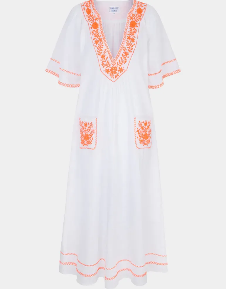 The Rhodes kaftan from Pink City Prints is beautifully hand-embroidered around the plunging neckline and pockets with bright neon orange florals that stand out against crisp white fabric. The short sleeves and hem are finished with more embroidery. Perfect for making a statement on beach days.