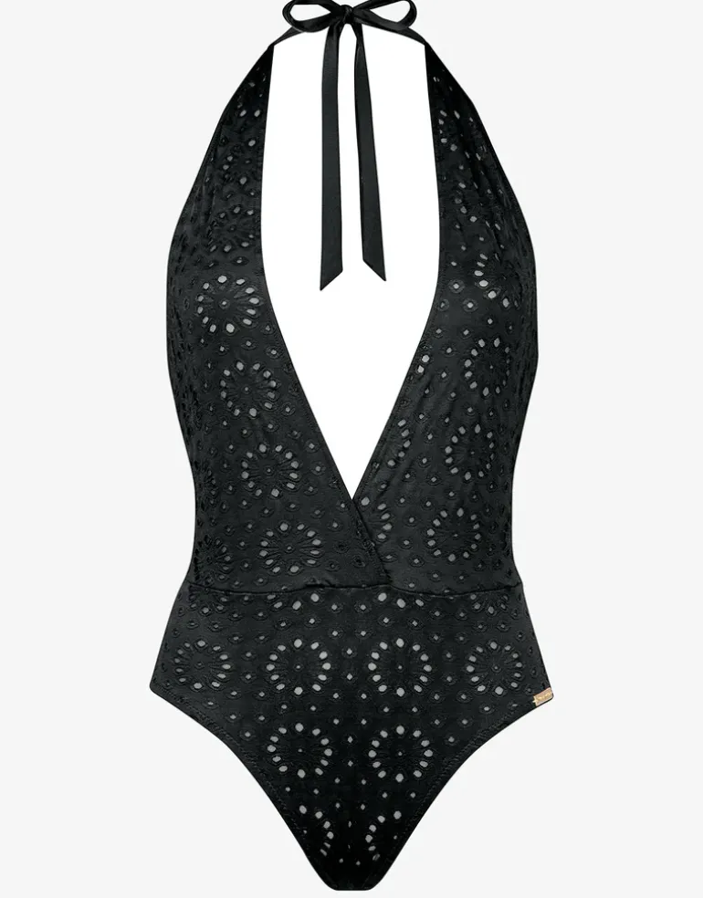 The Riviera Notes Plunge swimsuit from Watercult has a stunning plunging neckline coupled with a halter neck tie that shows off a low cut, exposed back. Broderie anglaise inspired fabric in a timeless deep black colour creates a strikingly feminine look.