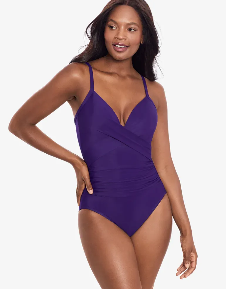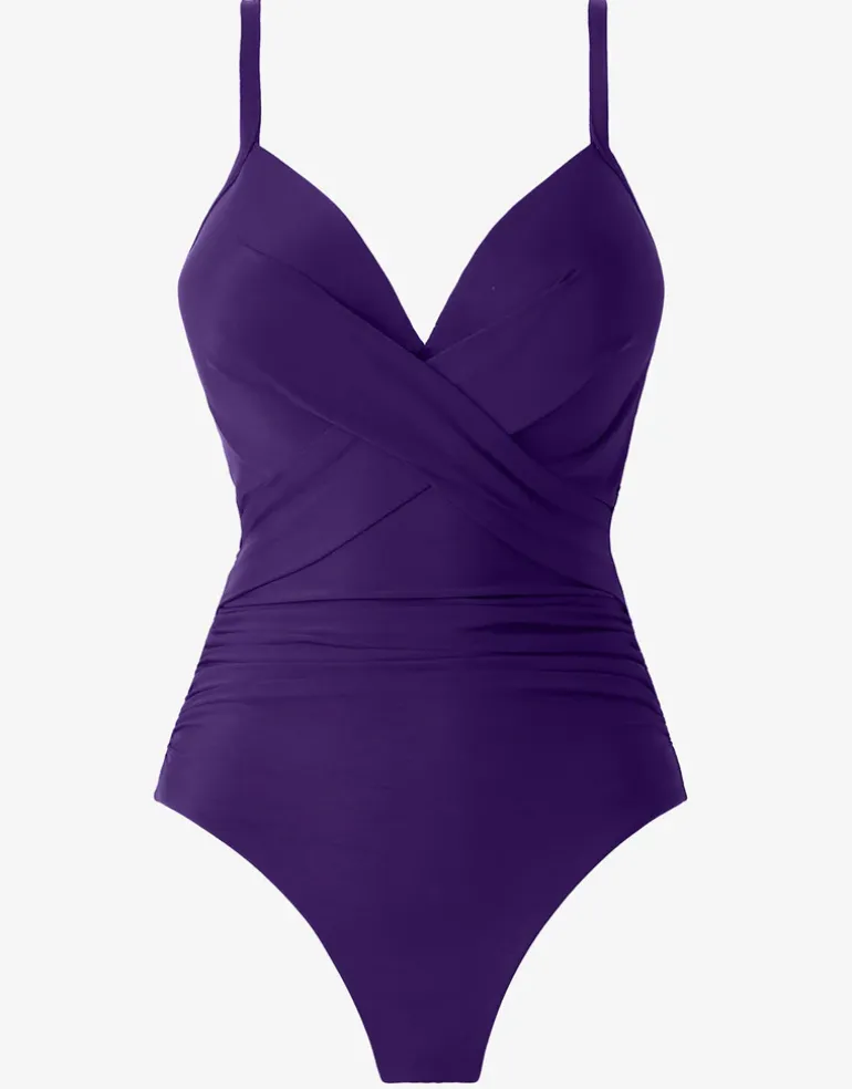 The Rock Solid Captivate swimsuit from Miraclesuit is a gorgeous shaped style in beautiful Mulberry purple with moulded underwired cups, narrow adjustable straps and pretty criss-cross back detail.
