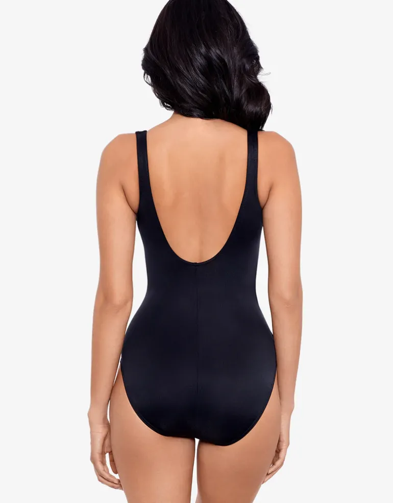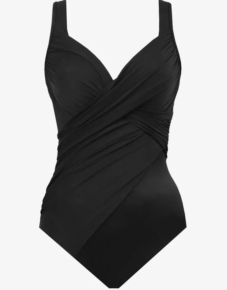 The Rock Solid Revele swimsuit from Miraclesuit is a classic black. With a V neck and wrap detail over the bust, inside it has moulded foam cups and underwire and the straps are padded for extra comfort.