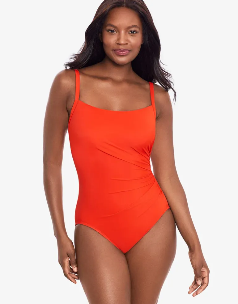 The Rock Solid Starr Swimsuit from Miraclesuit is a lovely simple tank style in gorgeous warm Arancio orange with elegant gathering to one side, narrow adjustable straps and hidden underwire for great support.