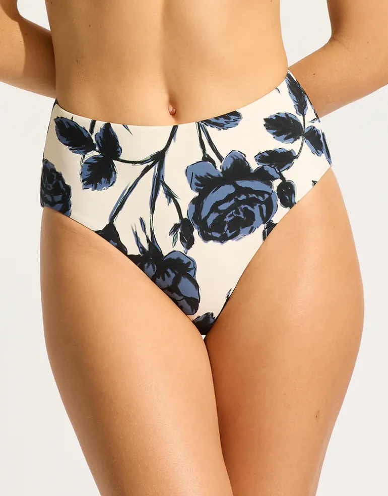 The Rococo High Waist bikini pant from Seafolly in a lovely black and blue floral print on an ecru white background is a high waisted pant with a low legline, offering full rear coverage.