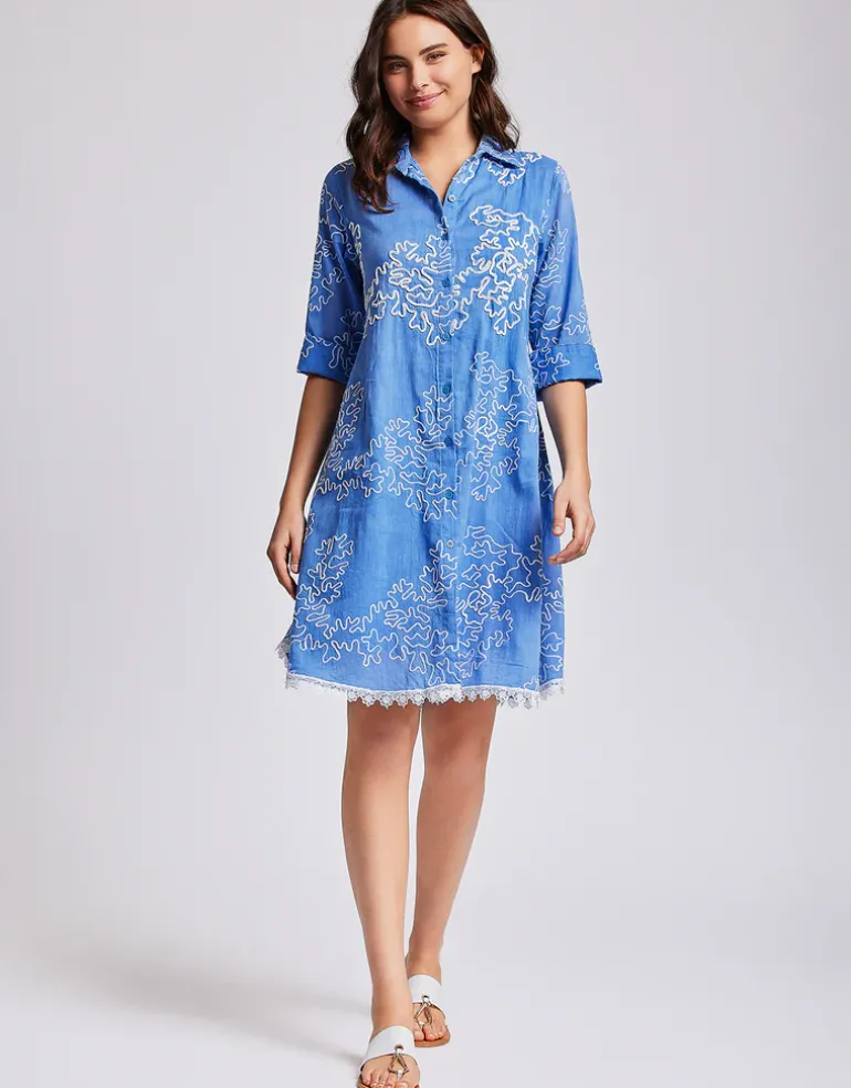 The Romina 3/4 Sleeve Shirt dress from Iconique features embroidery throughout, a traditional collar, a buttoned front and side slits for an elegant beach look.