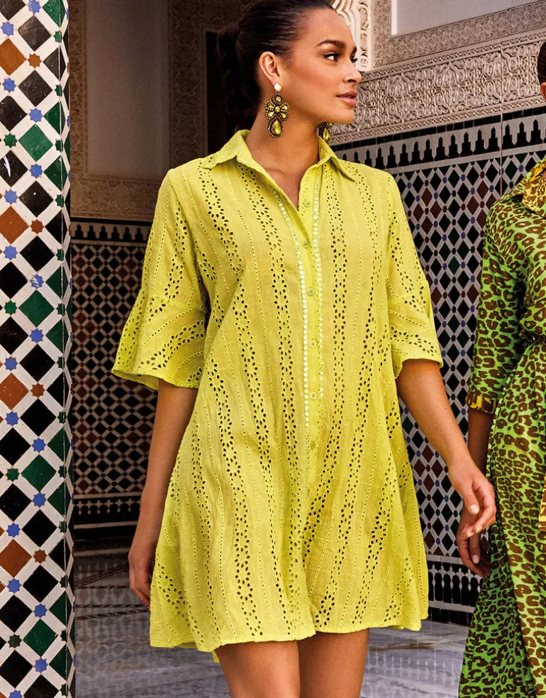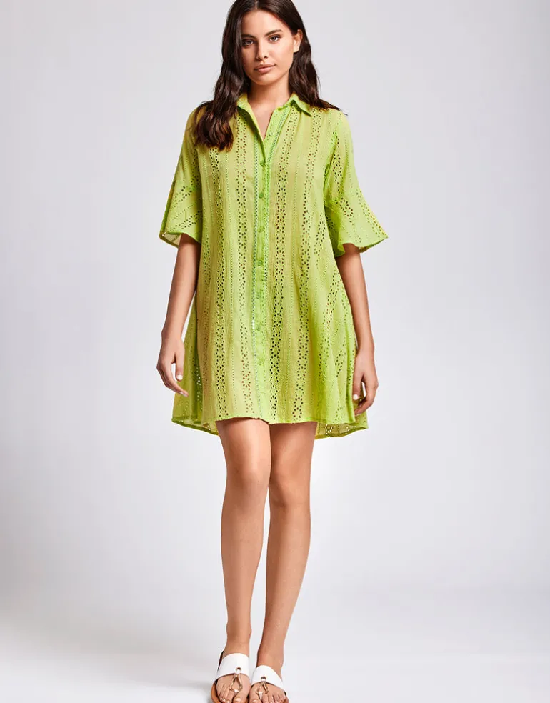 The Romina 3/4 Sleeve Shirt dress from Iconique in stunning lime green, features embroidery throughout, a traditional collar, a buttoned front and side slits for an elegant beach look.