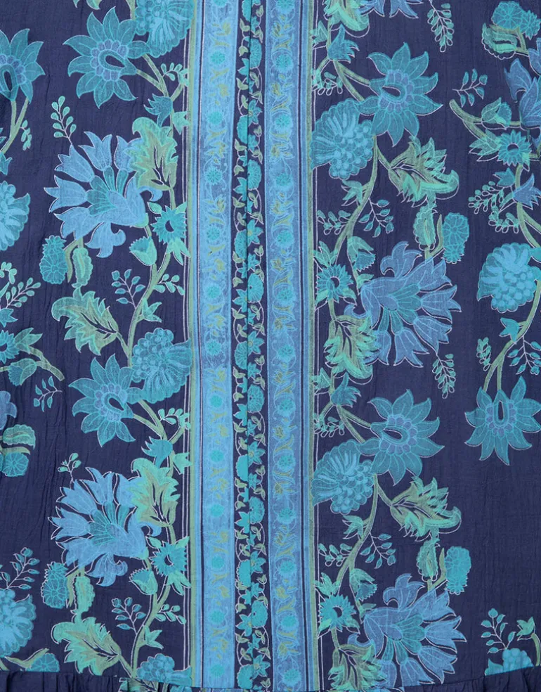 The Rose Border Print V-Neck Maxi dress from Juliet Dunn is a gorgeous kaftan style dress in deep Indigo blue with paler blue and green flowers and a border print to the neckline and hems. With loose elbow length sleeves, a deep V neck line and a tiered loose-fitting skirt.