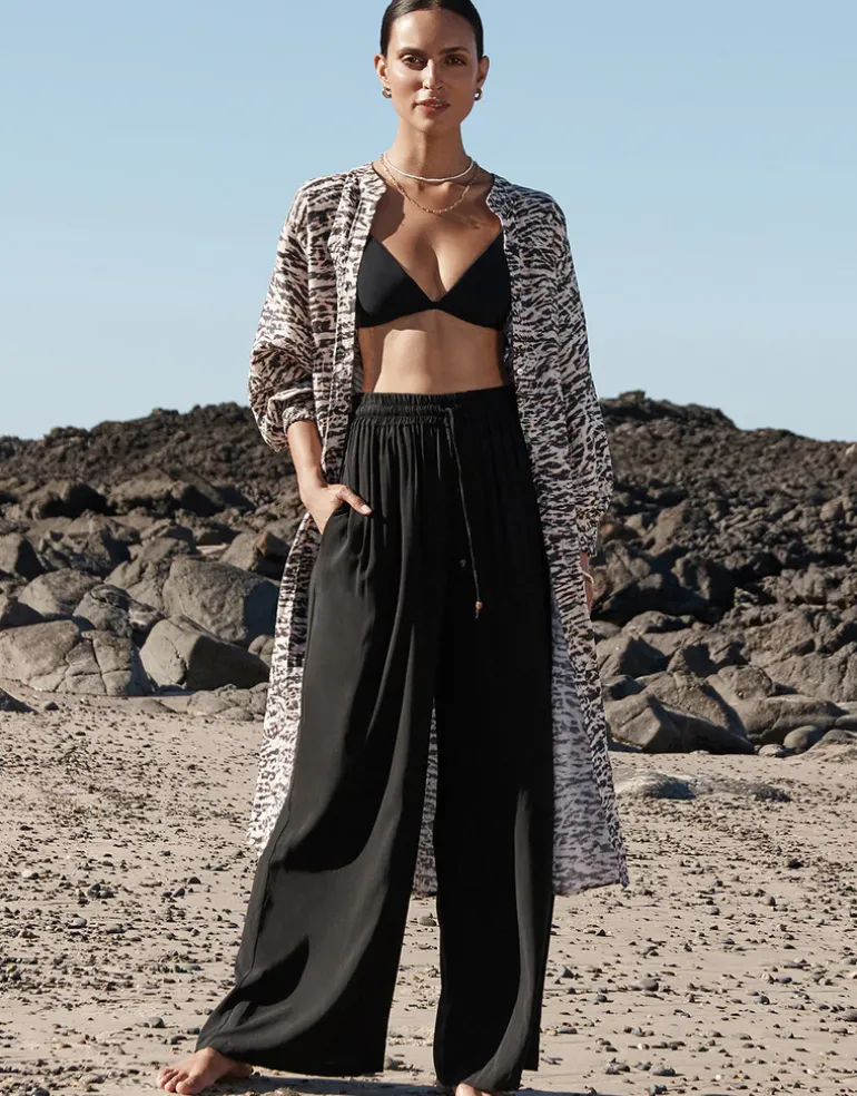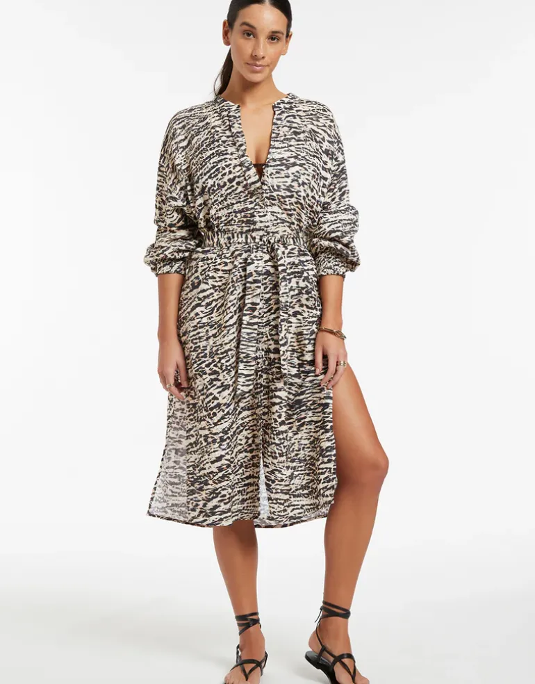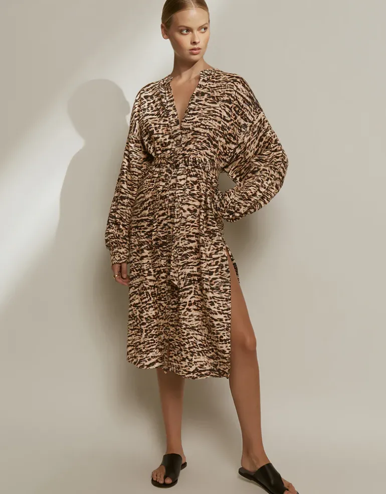 The Sahara Shirred Cuff Shirtdress from Jets is a lovely ankle-length linen button-through dress in an understated animal print, with a soft Nehru collar, cuffed dolman sleeves, side slits to the thigh and a wide tie at the waist.