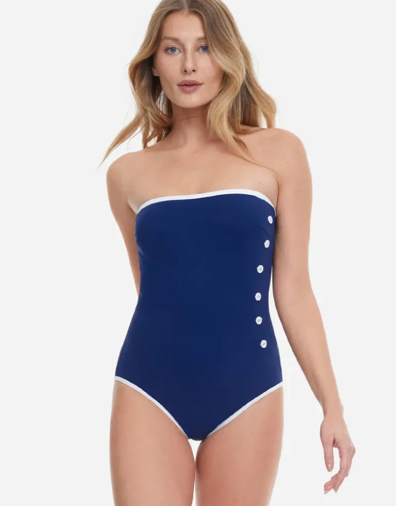 The Sail to Sunsets Bandeau swimsuit from Gottex is a chic looking bandeau style in navy blue with white piping at the neck and leg edges and white pretty white button detailing to one side. With soft padded cups, optional adjustable straps and tummy control.