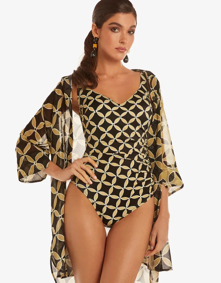 The Samoa Soft Cup Swimsuit from Roidal features an ornate gold and black geometric print. This elegant design includes a flattering V-neckline, ruching at the waist on the left side for a slimming effect, a scoop back, and soft cups for comfortable support.