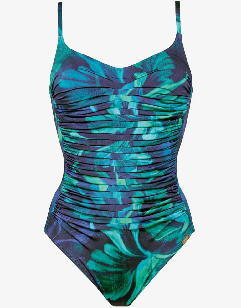 The Botanique Ruched Underwired swimsuit from Maryan Mehlhorn is an incredibly flattering, popular style thanks to ruching across the tummy, underwired cups and a shaped neckline. This aquatic-meets-tropical foliage design of blues and greens is beautiful and feminine.
