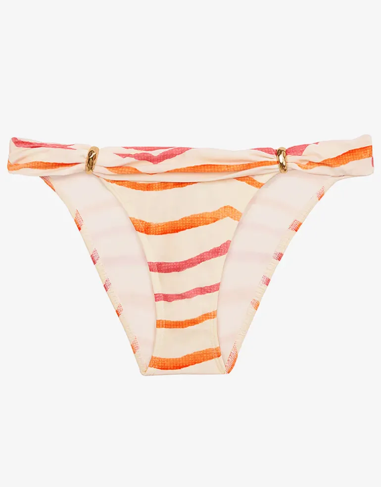 The Sandstone Bia Tube Full bikini pant from ViX in a lovely multicoloured chevron stripe on a white background, is a classic full cut Bia style with gold sliders at the hips.