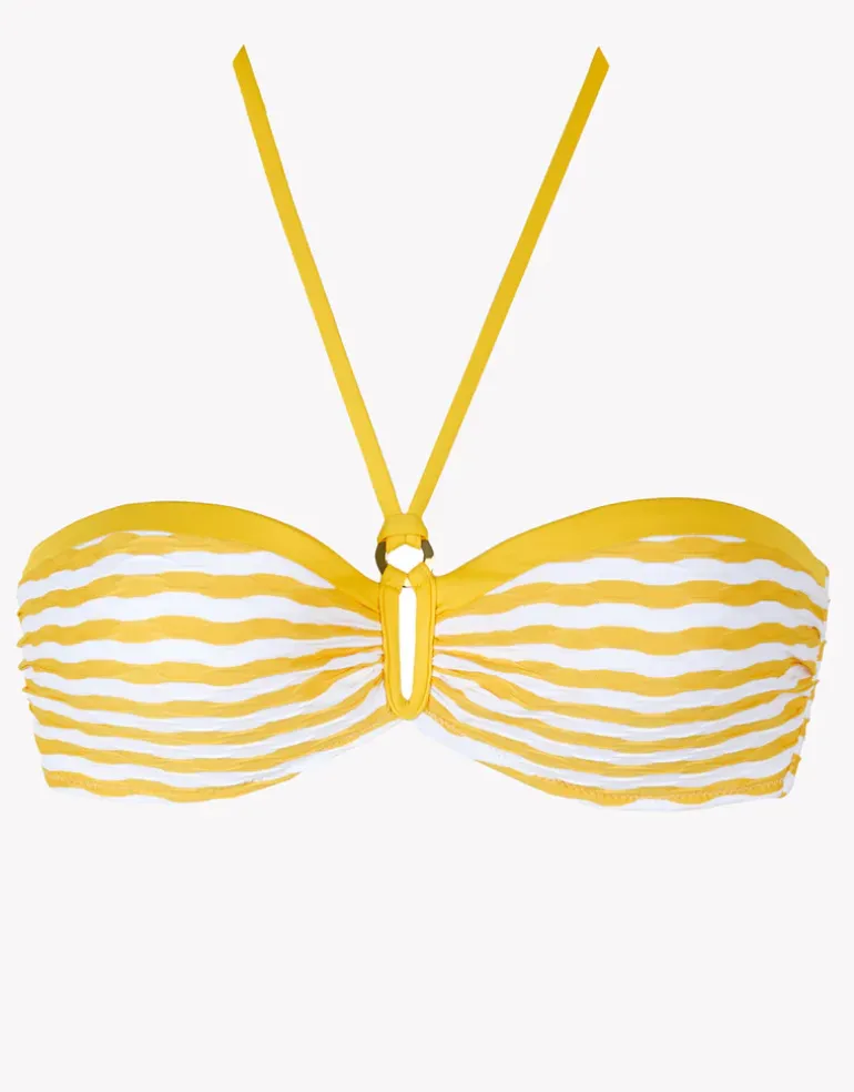 The Saona Bandeau bikini top from Tessy by Roidal in a lovely, nostalgic yellow and white stripe is a bandeau style with a ring detail between the cups and halter neck tie. The cups are underwired and moulded for great shape and support.