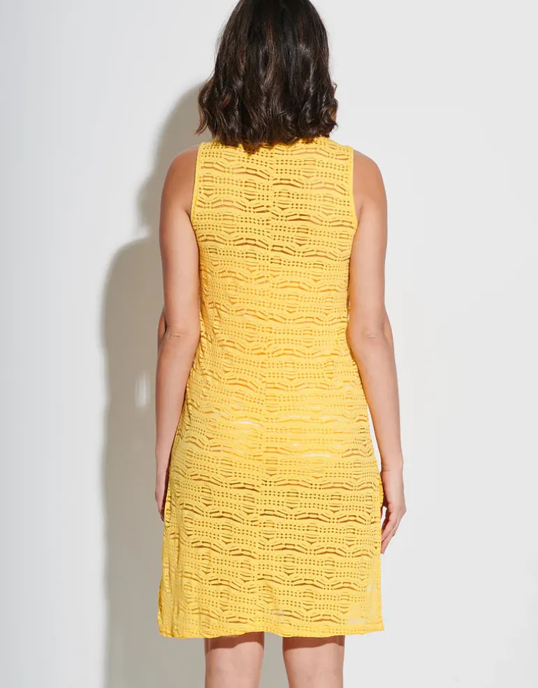 he Saona Leila beach dress from Tessy by Roidal in vibrant yellow is a mini-length, sleeveless design featuring a V-shaped neckline and side slits. Crafted from a lightweight mesh knit, it’s the perfect breezy cover-up for the beach.