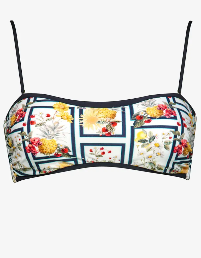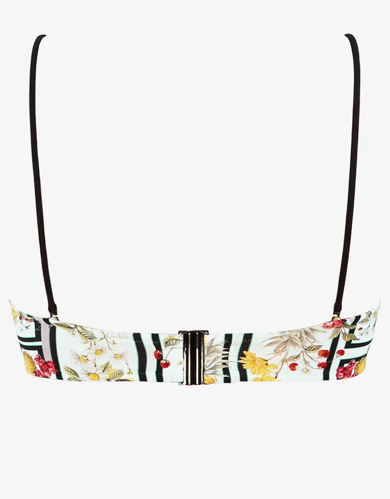 The Scenery Bandeau bikini top from Maryan Mehlhorn is a lovely bandeau style with removable cups and optional adjustable straps in the fabulous oriental-inspired Monochrome Garden print combining a fruit and floral design with black and green geometric panelling.