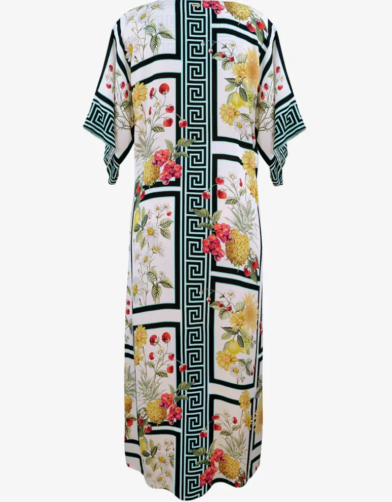 The fabulous Scenery Maxi kaftan from Maryan Mehlhorn is an oriental-inspired design combining a fruit and floral print with black and green geometric panelling. With wide sleeves and a V neck, this loose fitting design is a striking cover-up to match the Scenery swimwear.