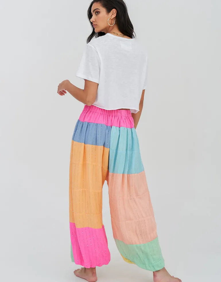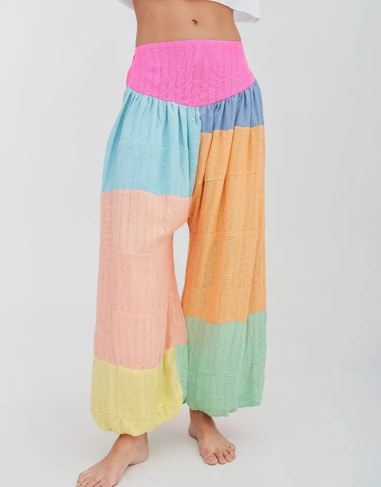 The gorgeous Sequin Aladin pants from Pitusa are effortlessly cool. In soft pastel colours, the loose-fit beach pants are gathered at the ankle and the waist.