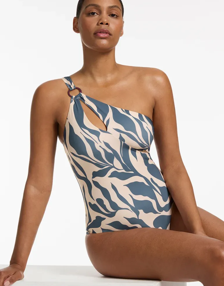 The Sereno One Shoulder Ring swimsuit from Jets is an asymmetrical style, beautifully elevated with purple ring detail at the shoulder and an elongated cut-out detail.