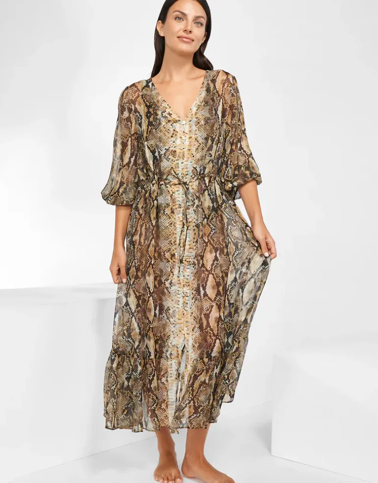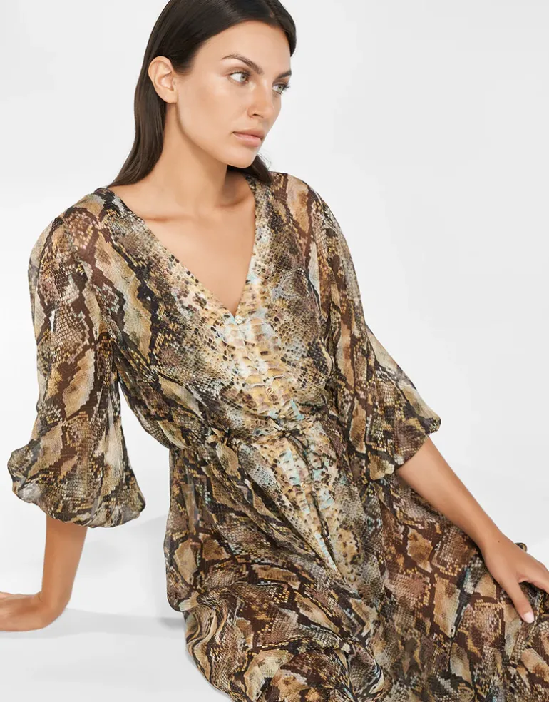 The Serpent Long Blouse dress from Maryan Mehlhorn is a sheer, ankle-length maxi dress in a snake-skin print of gold and earth tones. Delicate balloon sleeves emphasize its loose, floaty fit, while buttons at the front and an elegant tie belt will define the waist.