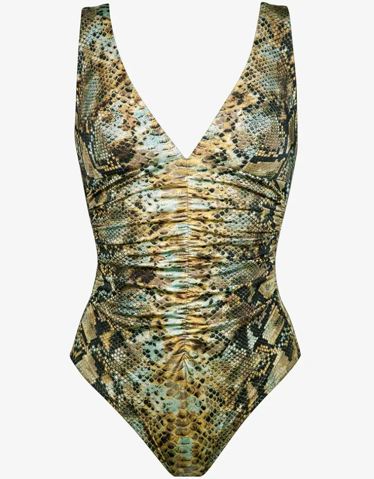 The Serpent Ruched Moulded swimsuit by Maryan Mehlhorn in this stunning Python print features a plunging neckline, ruching across the tummy and comfortable, wide straps that lead into an elegantly shaped back. The abstract snake-skin print features neutral, earth hues with hints of glacial grey and vanilla tones.