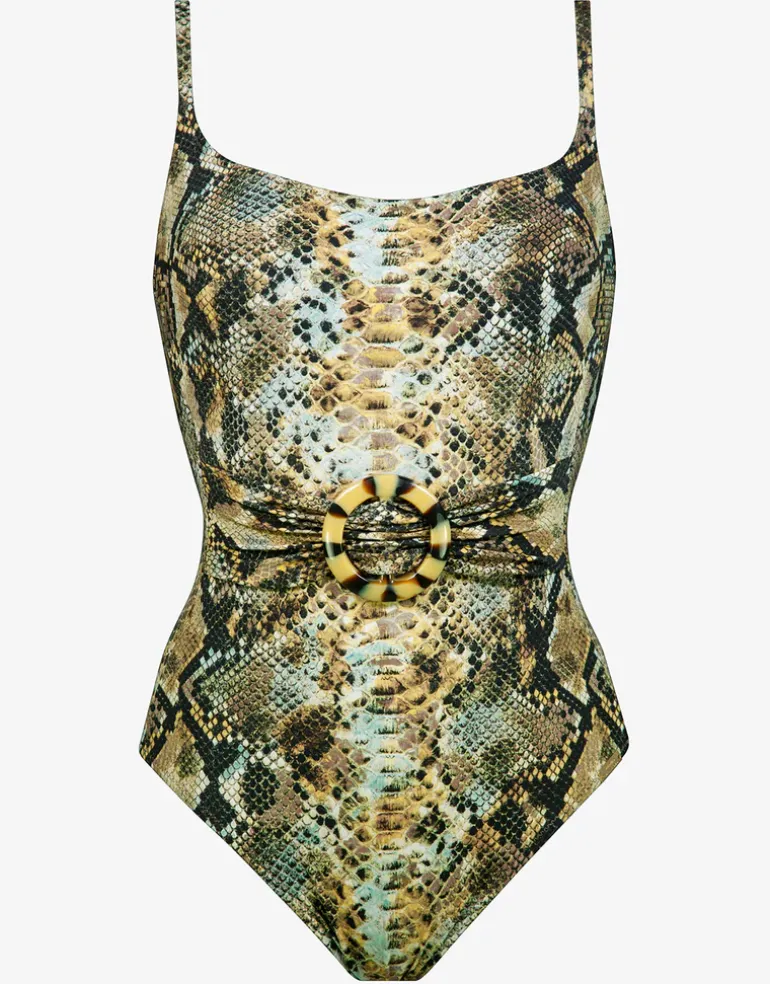 The Serpent Underwired Ring Front swimsuit by Maryan Mehlhorn is a tank-style swimsuit with adjustable straps and floating, underwired construction in a beautiful, Python animal print. Featuring a sash belt detail at the front with statement buckle in tortoiseshell.