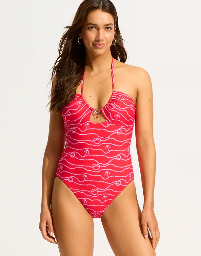 The Set Sail Drawstring Halter Swimsuit from Seafolly in hot Chilli Red nautical print has a halter, drawstring neck tie, gripper tape along the neckline to keep the suit in place and removable cups for shape and support. The Set Sail swimsuit features a peep hole front with metallic ring adorned with a red anchor charm.