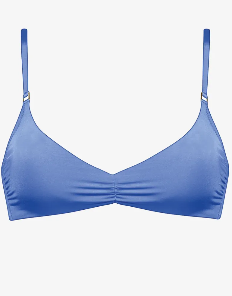 The Shimmering Solids Gathered Crop bikini top from Watercult in a lovely blue shimmering, swim fabric is a cropped style with gathering over the cups, removable moulded cups and adjustable straps for a great fit.