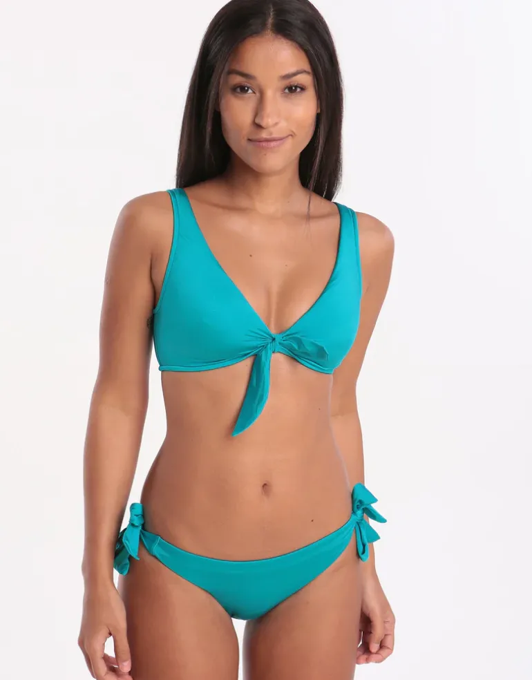Channel your sporty beach vibe wearing Seafolly’s Shine on Tie Front Crop Bikini Top. With its tie front feature, this bikini top is easy to put on but also is great for being active on the beach with its padded cups for extra comfort.